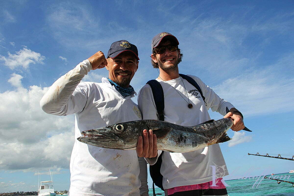 We arrived to our trolling spot in about 40 minutes with help of Garmin navigator, and slowed down approximately across from the Macao beach. We opened our outriggers and started fishing. In about 5 minutes we hooked first Mahi, regular size. Savannah, who was near us at that time pulled that fish aboard. In another 15 minutes she pulled her second fish Barracuda, which was a very good size! 12 pounds! Fishing continued. Tyler found cold beer in the fridge and didn’t want to pull any fish.