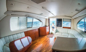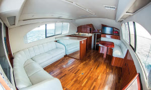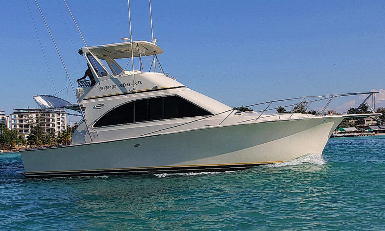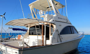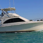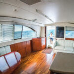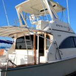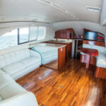 Fishing boat “Fortuna” is 42′ long, with maximum capacity of 8 people for fishing trips and you will have lots of space on the boat still! There is a spacious luxurious cabin with white leather couches, the bar, TV, shower and toilet.