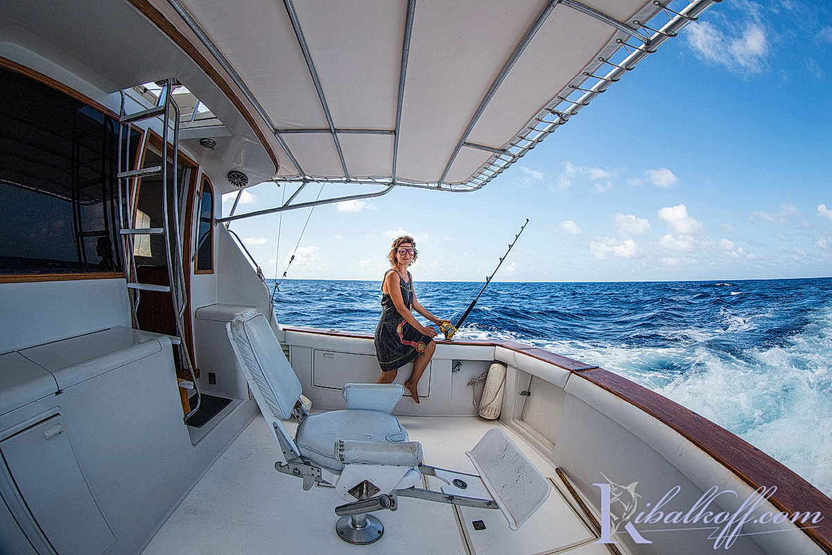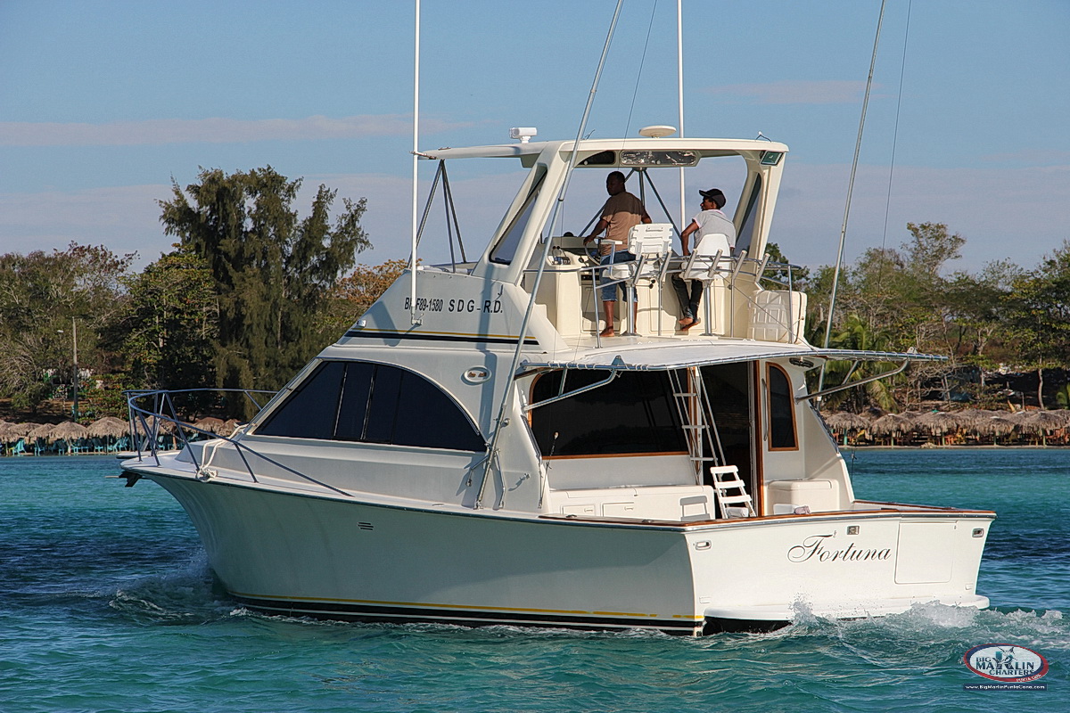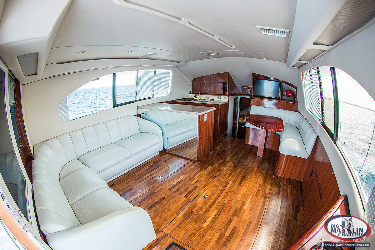 Fishing boat “Fortuna” is 42′ long, with maximum capacity of 8 people for fishing trips and you will have lots of space on the boat still! There is a spacious luxurious cabin with white leather couches, the bar, TV, shower and toilet.